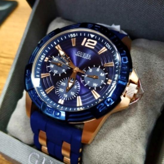 สายนาฬิกา: สายซิลิโคนสีน้ำเงินพร้อมตัวเชื่อมสายสีโรสโกลด์