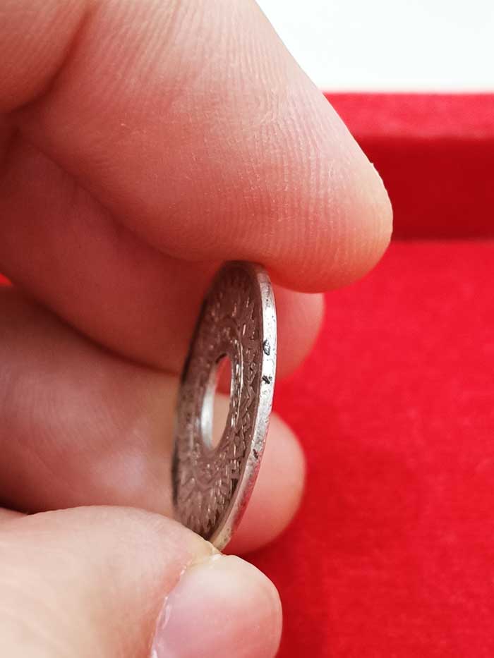 สภาพเหรียญผ่านใช้งาน ขอบเหรียญถูกกลึงฟันเฟืองหายไปเป็นขอบเรียบ