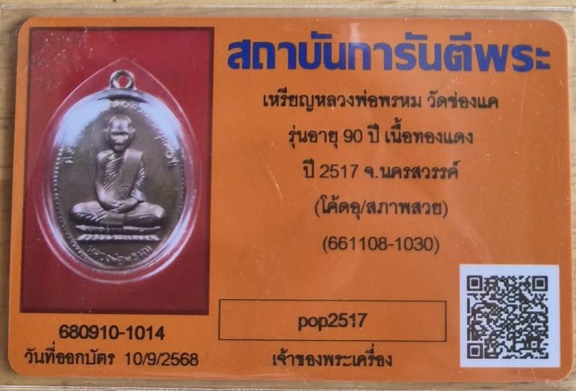 เหรียญหลวงพ่อพรหม รุ่นอายุ 90 ปี เนื้อทองแดง ( สภาพสวย ) พร้อมบัตร