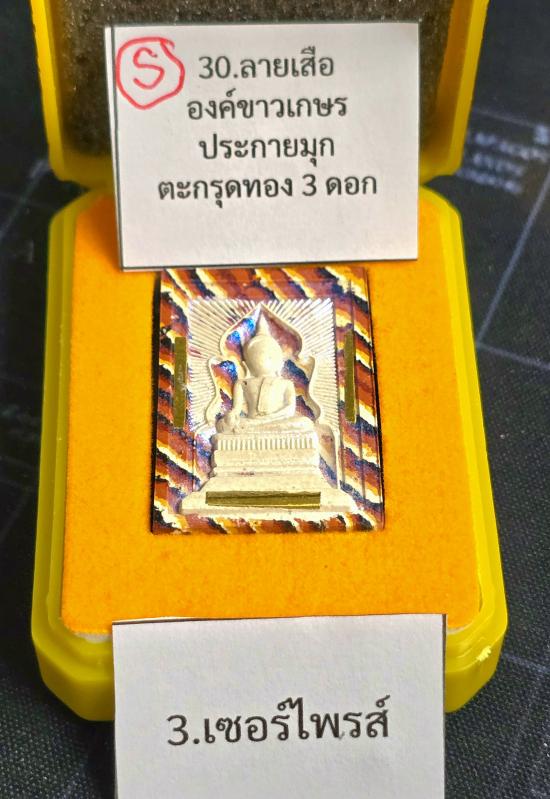 เนื้อลายเสือ องค์ขาวเกษร ประกายมุก ตระกรุดทองทิพย์ 3 ดอก พระปั้มได้คมชัด สวยมากๆๆครับ