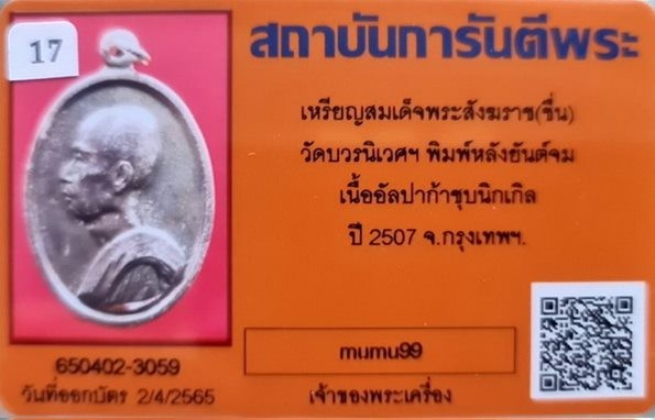 วัดใจ เหรียญสมเด็จฯพระสังฆราชชื่น เนื้ออัลปาก้า พ.ศ.2507 สวยๆ พร้อมบัตรรับรอง |