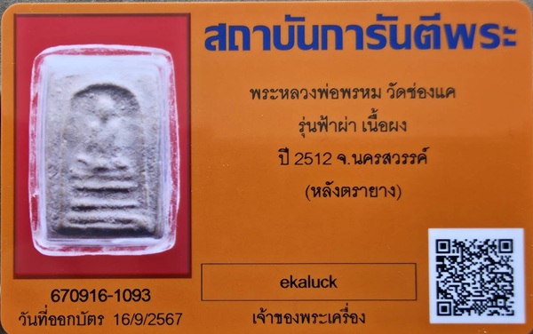 พระผงฟ้าผ่าหลวงพ่อพรหม วัดช่องแค จ.นครสวรรค์ ปี2512 พร้อมบัตรรับรอง