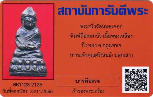 พระกริ่งวัดหนองจอก พิมพ์ถือดอกบัว ปี 2494 เนื้อทองเหลือง ท่านเจ้าคุณศรี(สนธิ์) จัดสร้าง เลี่ยมเงินหนาๆสวยมาก พร้อมบัตร G-Pra รับประกันความแท้ให้อีกชั้น พระแท้ดูง่ายมากๆครับ พระที่ออกวัดสุทัศน์หรือวัดอื่นๆราคาไปไกลหมดแล้วครับ รีบเก็บก่อนแพงครับ