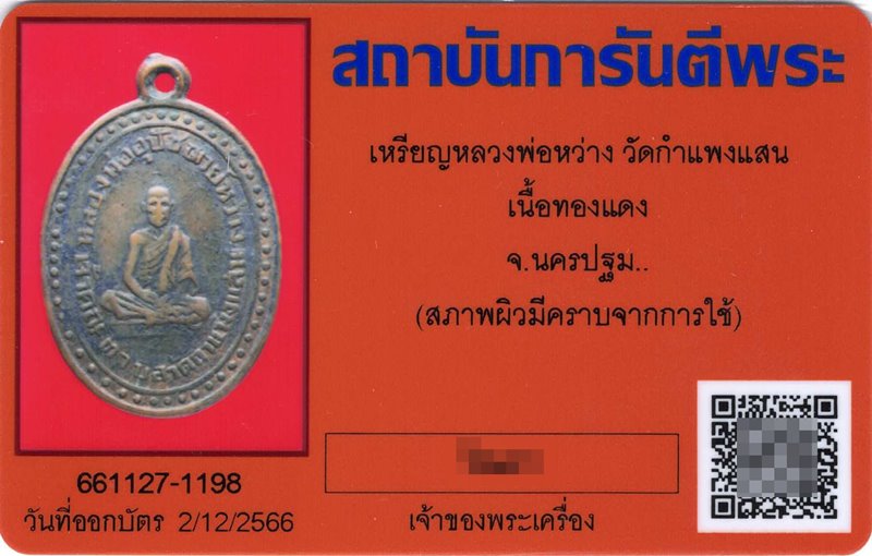 เหรียญรุ่นแรก ลพ.หว่าง วัดกำแพงแสน สุดยอดเกจิฯ รุ่นเก่าแห่งเมืองนครปฐม เป็นเหรียญขอบเลื่อยยุคเก่า สภาพยังน่ารัก เลี่ยมเงินกันน้ำอย่างดี พร้อมบัตร G-Pra ระบุสภาพผิวมีคราบจากการใช้ จัดเป็นเหรียญหายากอีกเหรียญที่พบเจอน้อยมากครับ โดยท่านสืบทอดวิทยาคมโดยตรงจาก ลพ.ทา วัดพะเนียงแตก, ลพ.แช่ม วัดตาก้อง ฯลฯ หลวงพ่อหว่าง ท่านเป็นพระอุปัชฌาย์ของ หลวงปู่แผ้ว วัดรางหมัน เทพเจ้าแห่งเมืองกำแพงแสน โดยหลวงพ่อหว่าง มรณภาพ พ.ศ.2508 สิริอายุรวม 72 ปี