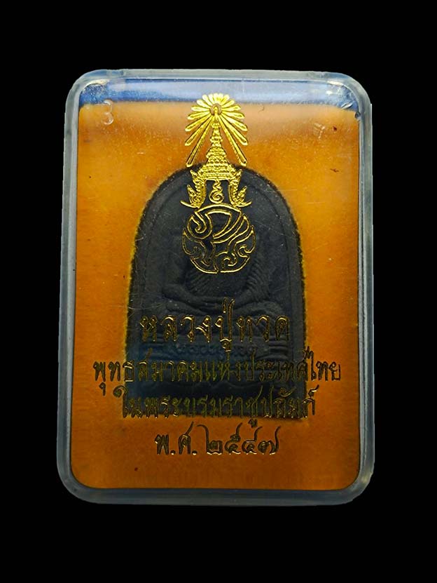 พระหลวงปู่ทวด รุ่น ภปร. ปี 2547 พิมพ์กลีบขนุน (พระรอด นิยม) หลังฝังแผ่นพระปรมาภิไธย ภ.ป.ร. หมายเลข 59087 พิธีใหญ่ วัดพระแก้ว พุทธสมาคมแห่งประเทศไทย ในพระบรมราชูปถัมภ์ได้จัดแถลงข่าวการจัดสร้าง
