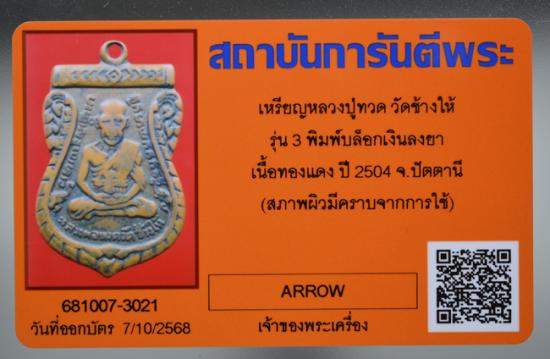 เหรียญหลวงปู่ทวด วัดช้างให้ จ.ปัตตานี รุ่น 3 พิมพ์เสมา ปี 2504 บล็อกเงินลงยา พร้อมบัตรรับรอง