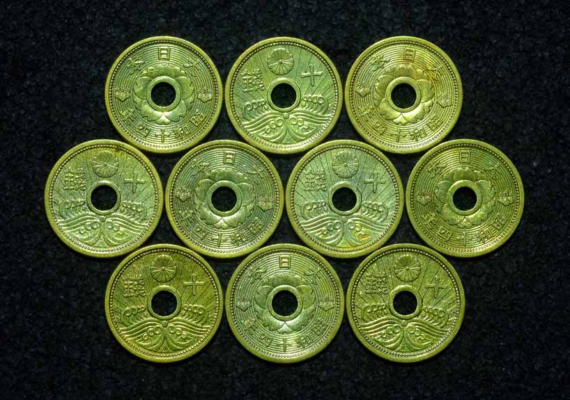 เหรียญกษาปณ์ญี่ปุ่น 10 sen สมัยโชวะ(Showa jidai - รัชสมัยสมเด็จพระจักรพรรดิฮิโรฮิโตะ ปีที่ 14) - ค.ศ.1939 รวม 10 เหรียญ UNC ไม่ผ่านใช้