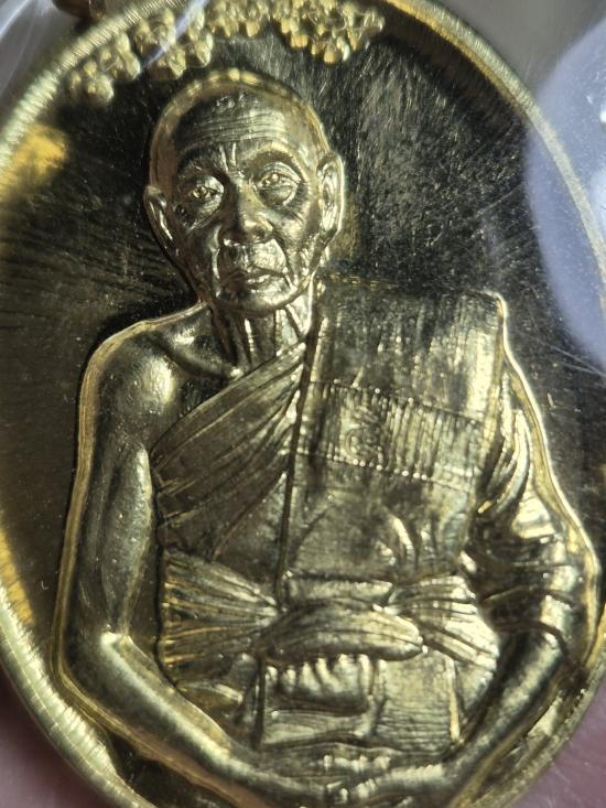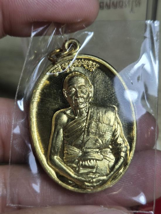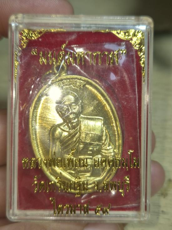 หลวงพ่อเพี้ยน วัดเกริ่นกฐิน อำเภอบ้านหมี่ จังหวัดลพบุรี รุ่น มนต์มหากาฬ (ไตรมาส 59) เนื้อทองฝาบาตร สร้างปี พ.ศ. 2559 |