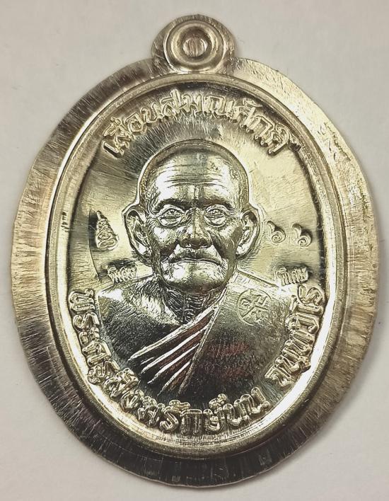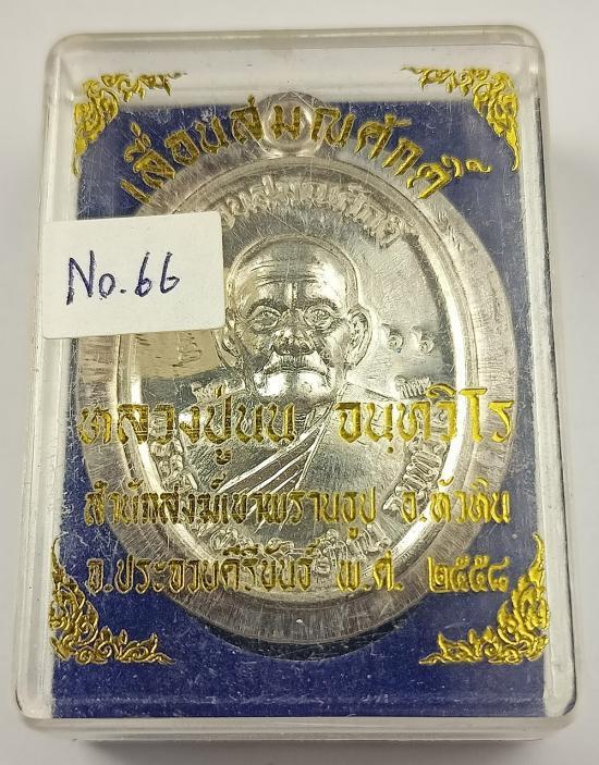 (เลขคู่สวย เบอร์ 66) เหรียญเลื่อนสมณศักดิ์ หลวงปู่นนท์ สำนักสงฆ์เขาพรานธูป เนื้อเงินไม่ตัดปีกหลังเรียบ (มีจาร) เบอร์ 66 พร้อมกล่องเดิมครับ (น้ำหนักเหรียญ 17.12 กรัม)