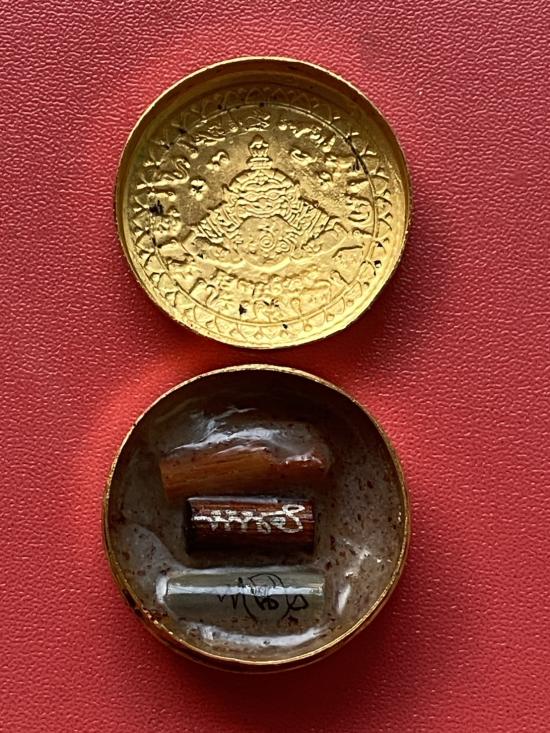 เคาะเดียวแดง สีผึ้งพระราหู รุ่น มงคลจักรวาล เนื้อ โลหะชุบทองลงยาสีน้ำเงิน ขอบสีแดง ขนาด3.2ซม |