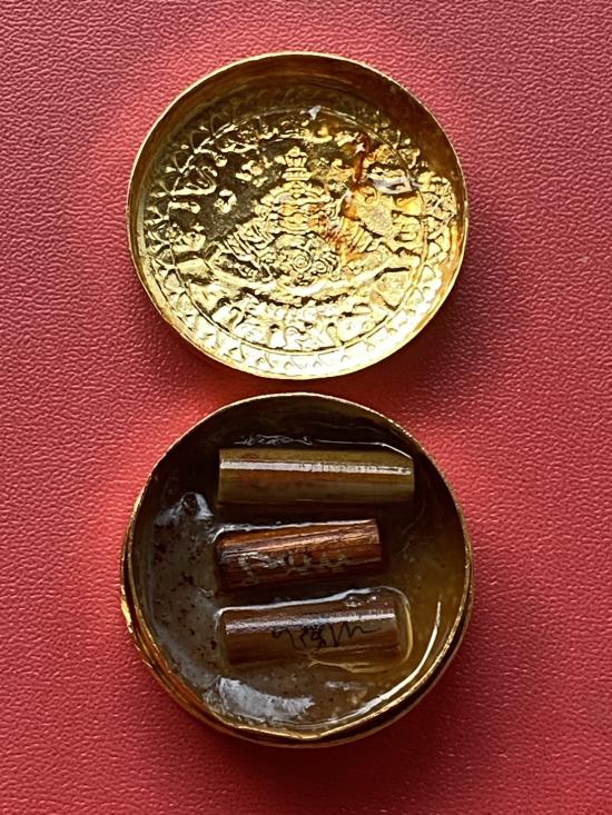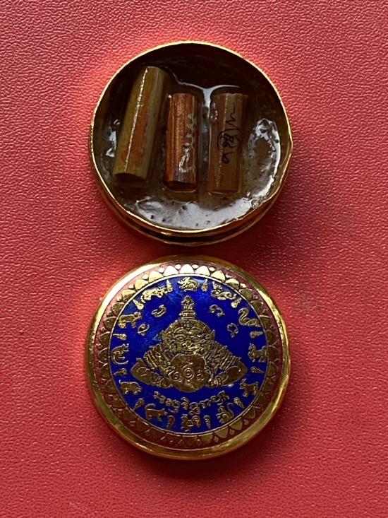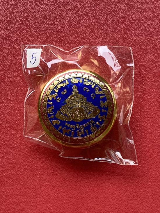 เคาะเดียวแดง สีผึ้งพระราหู รุ่น มงคลจักรวาล เนื้อ โลหะชุบทองลงยาสีน้ำเงิน ขอบสีแดง ขนาด3.2ซม |