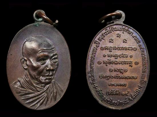 เหรียญหลวงพ่อเกษม สุสานไตรลักษณ์ เหรียญรูปไข่หันข้าง รุ่น สวัสดี ๑๔ หรือที่รู้จักกันดีในนาม เหรียญกิ่งไผ่ จัดสร้างปี ๒๕๑๘ เนื้อทองแดง