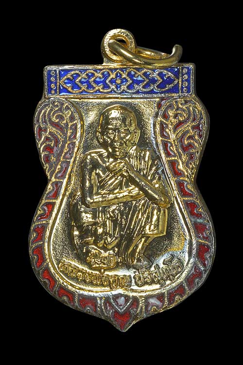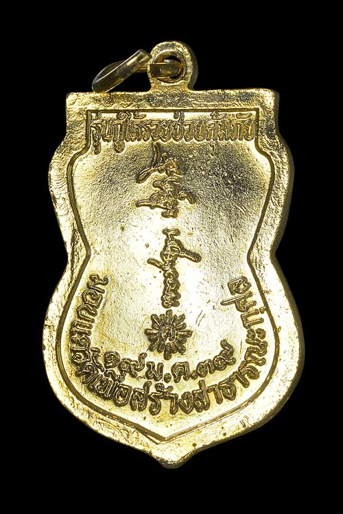 เหรียญ หลังลายเซ็น รุ่น กูให้รวยช่วยคุ้มภัย มอบแด่วัดเพื่อสร้างสาธาณธกุศล ( เนื้อกะไหล่ทอง ลงยา 2 สี บนน้ำเงิน กนกแดง ) พ.ศ.2539 ( กล่องเดิม )