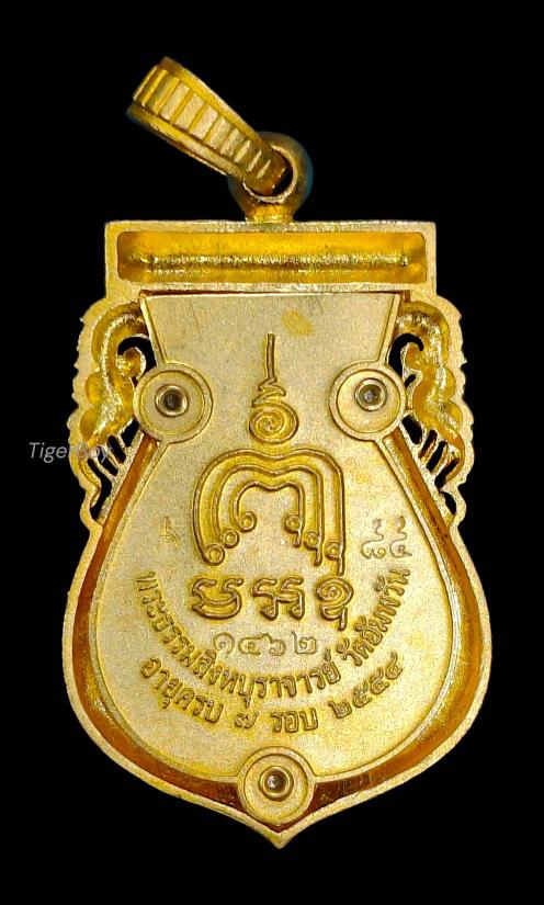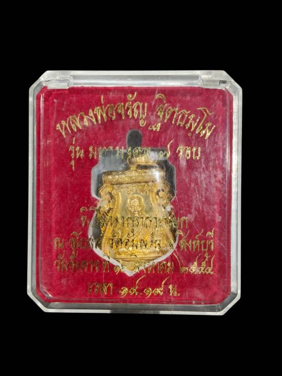 เหรียญเสมาฉลุลายยกองค์ หลวงพ่อจรัญวัดอัมพวัน จ.สิงห์บุรี รุ่นมหามงคล ๗ รอบ เนื้อทองระฆัง หมายเลข ๑๔๖๒ พร้อมกล่องเดิม