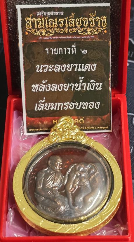 เหรียญหล่อเนื้อ นวะโลหะ(2หน้า) ลงยาแดง หลังยาน้ำเงิน เลี่ยมกรอบชุบทองพับหลัง