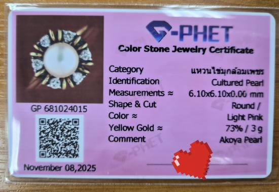 แหวนไข่มุกล้อมเพชรแท้ (ไข่มุกอะโกย่า/Akoya Pearl) สี Light Pink ตัวเรือน Gold 73% น้ำหนักรวม 3 กรัม size 49 *มีเซอร์G-Phet*