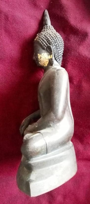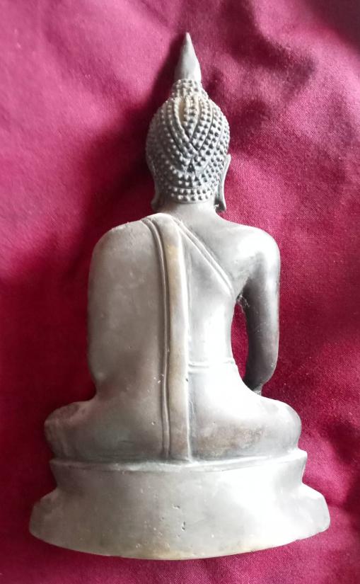พระรัชกาลยุคปลาย ปางมารวิชัย พิมพ์แบบอู่ทองหน้าหนุ่ม หน้าตักประมาณ 4 นิ้ว 6 หุน เนื้อทองเหลืองเก่า ใต้ฐานดินไทยเต็ม ๆ วรรณสองสี มองเห็นแกนลวดหุ่นพระชัดเจนเก่ามีอายุหลายสิบปี ผิวหิ้งเดิม ๆ สภาพสวยตามรูป ส่งฟรีทั่วไทย รับประกันตามกฎครับ