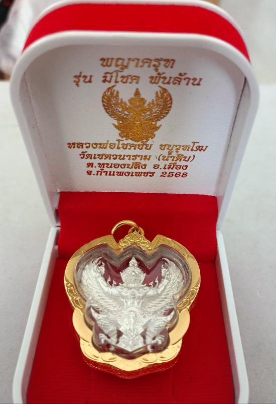 วัดใจเคาะเดียวแดงจ้า พญาครุฑ มีโชคพันล้าน หลวงพ่อโชคชัย วัดน้ำดิบ เนื้อมหาชนวนชุบเงินจิวเวลรี่ เลี่ยมกรอบชุบทองไมครอน เคาะเดียวแดงจ้า