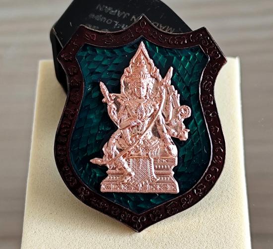 เหรียญท้าวมหาพรหม รุ่นเจ้าสัวพันล้าน(บอย ท่าพระจันทร์) เนื้อชนวนบอยท่าพระจันทร์ ลงยาพื้นเขียวขอบแดง หน้ากากชุบทองPink Gold โค๊ตนำฤกษ์ No.๑๒๑ พร้อมกล่องเดิม (สร้าง 198 เหรียญ)