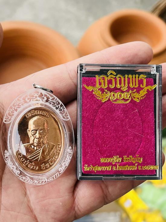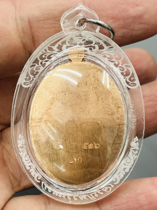 รายละเอียด เจริญพรบนรุ่นเเรก เนื้อทองเเดง หลังเรียบ ตอกเเจกในพิธี พร้อมเลี่ยม กล่องเดิมครบ เลข 526
