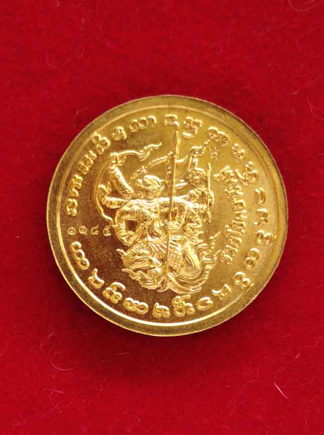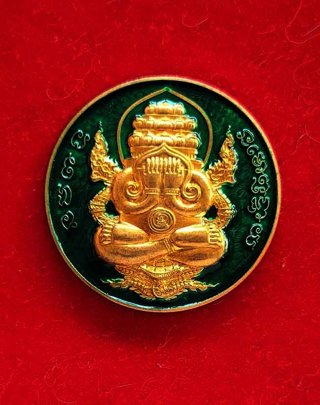 เหรียญพระปิดตาพังพระกาฬ หลวงปู่มหาศิลา สิริจันโท รุ่นรวยโชคอนันต์ เนื้อทองฝาบาตร ลงยาเขียว no.1185 แยกจากชุดกรรมการลงยา กล่องเดิม