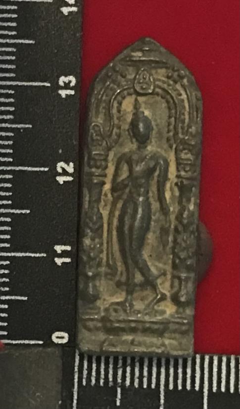 พระลีลากำแพงนิ้ว(ซุ้มแจกัน)พิมพ์ท2 หน้า,เนื้อชินเงิน หรือ ชินสังฆวานร ขึ้นจาดกรุพร้อมพระกำแพงศอก พระมเหศวร พีะผวสุพรรณ กรุวัดพระศรีรัตนมหาธาตุ จ.พิษณุโลกทสกุลสำนักอู่ทองยุคต้น ผู้สร้างคือมหาฤาษีพิมพ์พิลาไลย(ฤาษีตาไฟ)