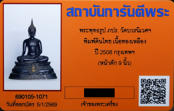 พระบูชา (ภปร.) รุ่นแรกวัดบวร หน้าตัก 9นิ้ว! เนื้อทองเหลือง หล่อหนา นิยม (พิมพ์ดินไทย) ปี2508 ฐานตะปู มีลวดขึ้นหุ่นพระ หล่อในพิธี ปี08 สุดยอดหายาก! + บัตรรับรอง G-PRA