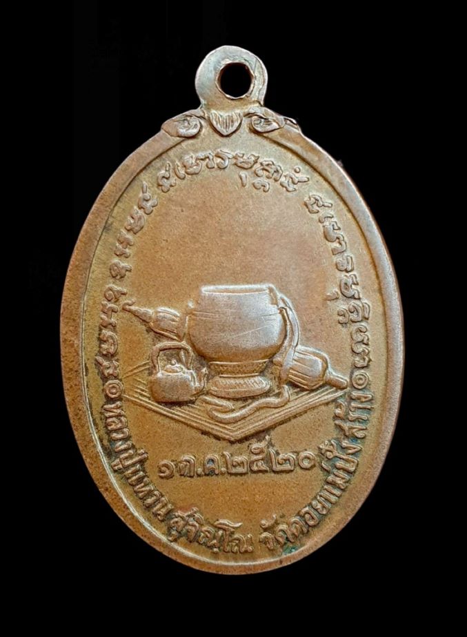 ใต้หูห่วงมีลวยดอกไม้ ด้านหลังมีอัฐบริขาร บาตร กลด กาน้ำ ผ้านิสีหนะ พระควถวอักษรขอม "นะ