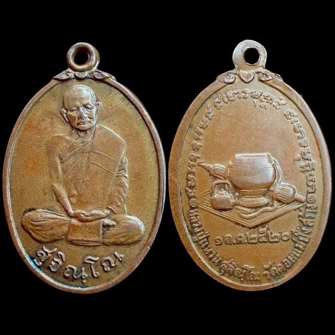 เป็นเหรียญรูปไข่ ด้านหน้ารูปหลวปู่นั้งมาธิเต็มองค์ห่มเฉลียง พาคสังฆาฏิ จารึกฉายา "สุจิณฺโณ"