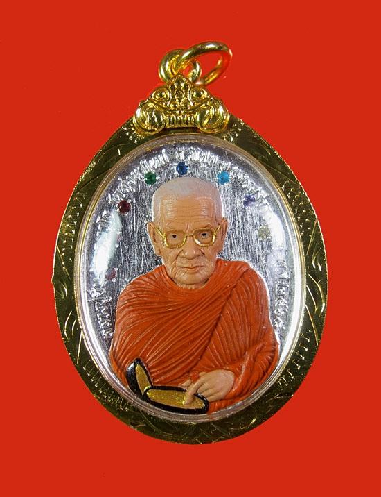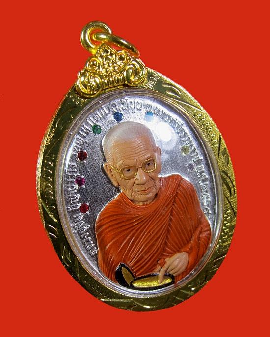 เหรียญ ปลดหนี้พันล้าน หลวงปู่อิ่ม ปัญญาวุโธ วัดทุ่งนาใหม่ นครศรีธรรมราช เนื้อชุดเงิน หน้ากากเพ้นท์ ฝังพลอยนพเก้าขอบใน เลี่ยมพรอบทองพับหลัง สร้าง 9 เหรียญ ตอก ๗๗๗