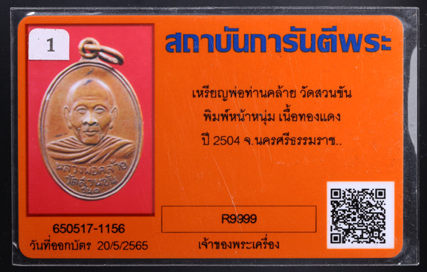 เหรียญพ่อท่านคล้าย วัดสวนขัน ปี 2504 หน้าหนุ่ม