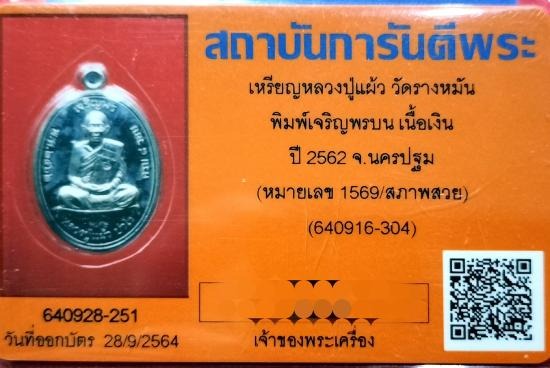 บัตรสภาพสวย...เหรียญเจริญพรบน หลวงปู่แผ้ว วัดรางหมัน เนื้อเงิน NO.1569 สภาพสวยแชมป์ ผิวกระจกเดิมๆ เลี่ยมเก็บผิวเรียบร้อย มาพร้อมบัตรรับรอง สภาพสวย
