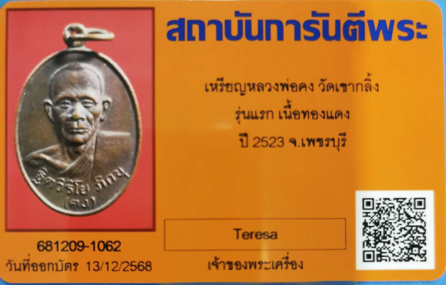 เหรียญ รุ่นแรก หลวงพ่อคง วัดเขากลิ้ง เพชรบุรี ปี2523 พร้อมบัตรรับรอง บล็อกสายฝน
