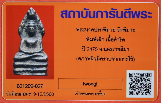 พระนาคปรกพิมาย วัดพิมาย พิมพ์เล็ก เนื้อสำริด ปี 2475 จ. นครราชสีมา พร้อมบัตรรับรอง เคาะเดียวแดง