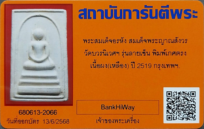 ด้านหลังองค์พระมีชื่อของเจ้าประคุณสมเด็จพระญาณสังวรและเส้นเกศาของท่านบรรจุอยู่