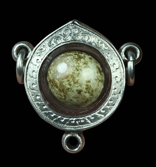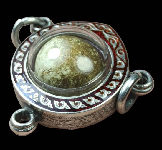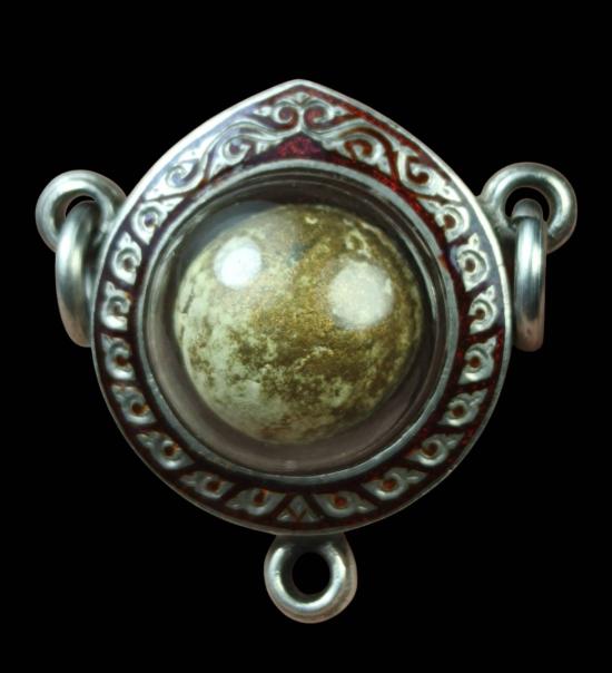 ลูกอมเนื้อขาว บรอนด์ทอง เลี่ยมกรอบเงินลงยาแบบ 3 ห่วงสภาพสวย ไม่ทราบที่ครับ