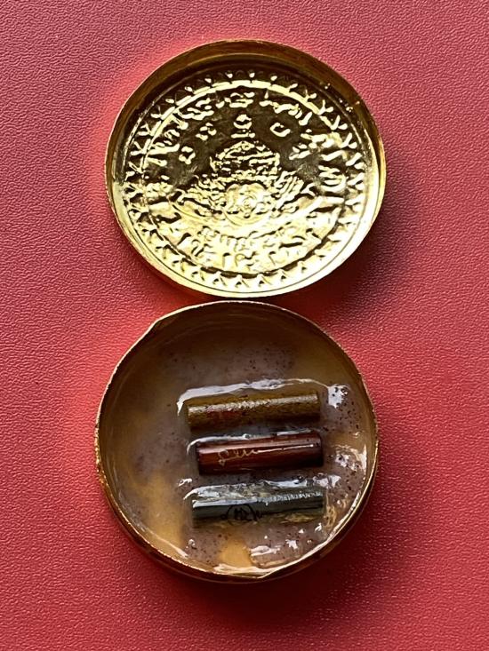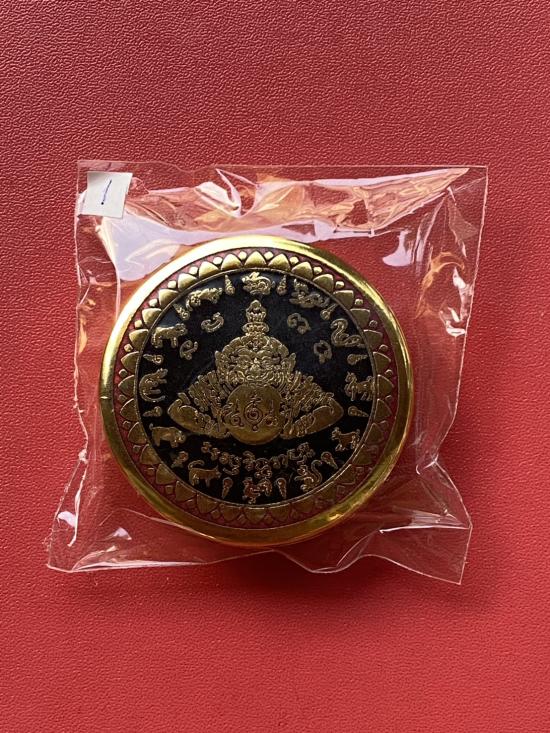 เคาะเดียวแดง สีผึ้งพระราหู รุ่น มงคลจักรวาล เนื้อ โลหะชุบทองลงยาสีดำขอบสีแดง ขนาด 5ซม