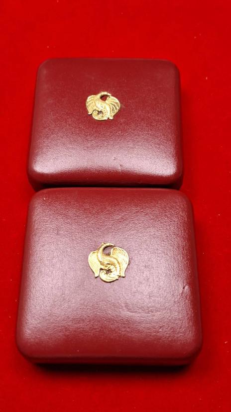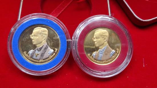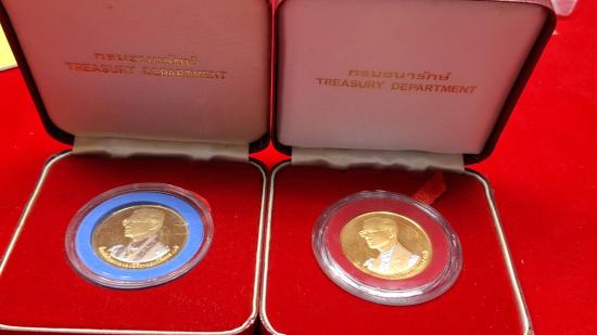 เหรียญที่ระลึกในหลวงรัชกาลที่ 9 หลังเขาชีจรรย์ กรมธนารักษ์ จัดสร้าง ปี 2538 เหรียญแท้ทำกะหลั่ยทองเงา/3 กษัตริย์ สภาพสวยมาก ทั้งหมด2เหรียญ+กลองเดิม