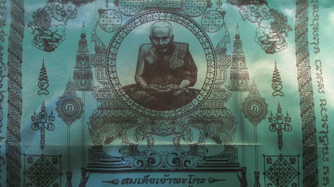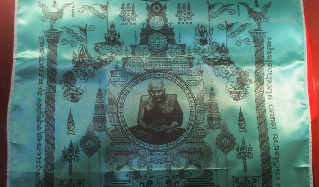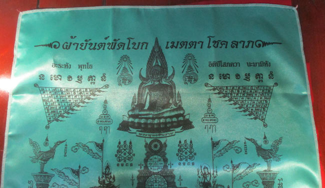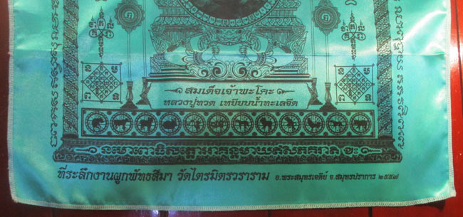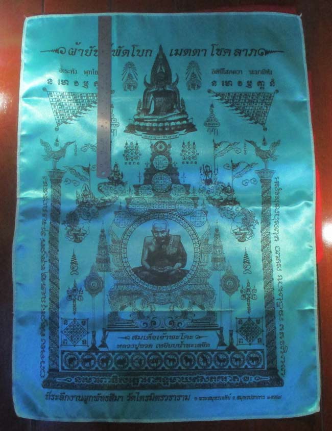 ผ้ายันต์ ที่ระลึกงานผูกพัทสีมา วัดไตรมิตรวราราม อ.พระสมุทรเจดีย์ จ.สมุทรปราการ ๒๕๕๗ ลวดลายสวย ครับ (พระบ้าน ครับ)