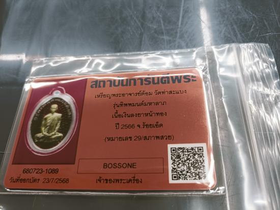 พระอาจารย์ต้อม วัดท่าสะแบง รุ่น ทิพพมนต์มหาลาภ เนื้อเงินลงยาสีแดงหน้ากากทองคำ หลังอุดมวลสาร เบอร์ 29 พร้อมใบเซอร์ G-PRA แถมฟรีกรอบทองเหลืองชุบทองฝังเพชร มูลค่า 1500 บาท