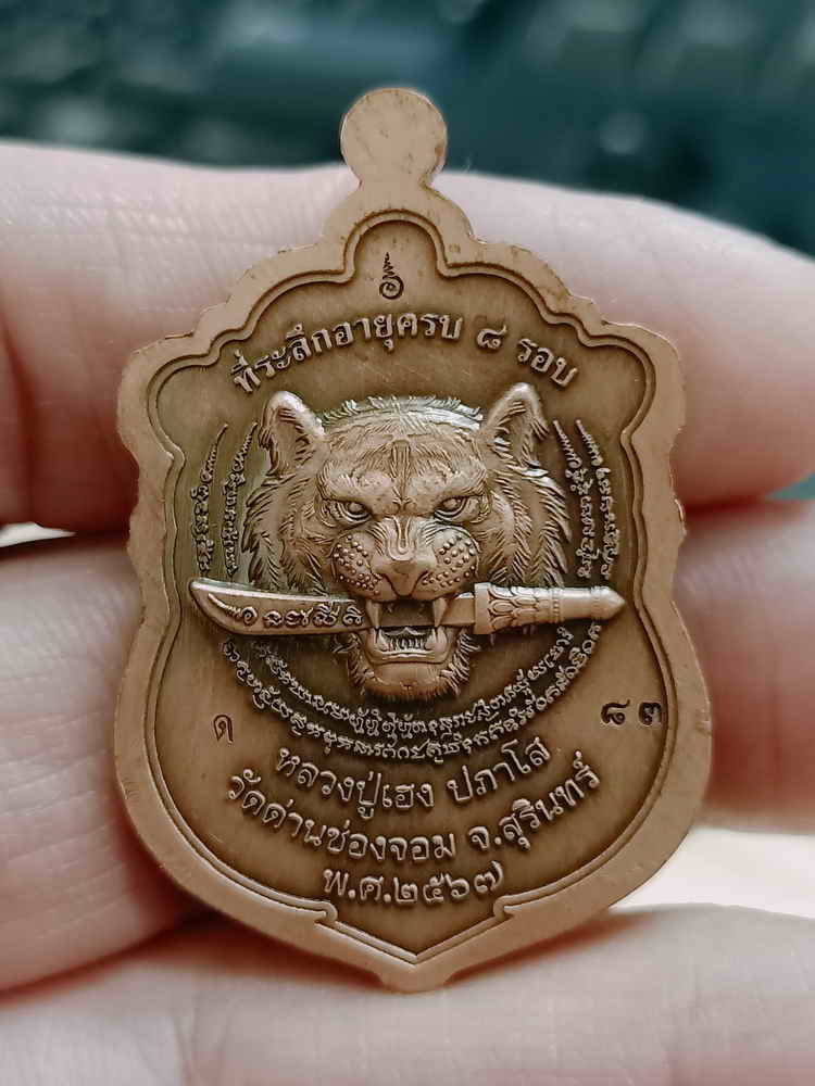 วัดใจ 100 เหรียญเสมาเสือคาบดาบ หลวงปู่เฮง ปภาโส วัดบ้านด่านช่องจอม จ.สุรินทร์ 2567 ทองแดงซาติน ลงยาลายธงชาติ หมายเลข 83 กล่องเดิม***สวยคม