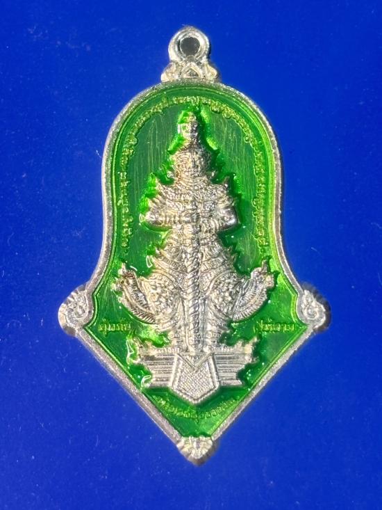 เหรียญท้าวเวสสุวรรณ รุ่นคุ้มภัยให้ลาภ หลวงพ่ออิฏฐ์ วัดจุฬามณี พิมพ์จำปีใหญ่ ปี2563 เนื้อชนวนกะไหล่เงินลงยาเขียว สร้างน้อย 999 เหรียญ พร้อมกล่องเดิม