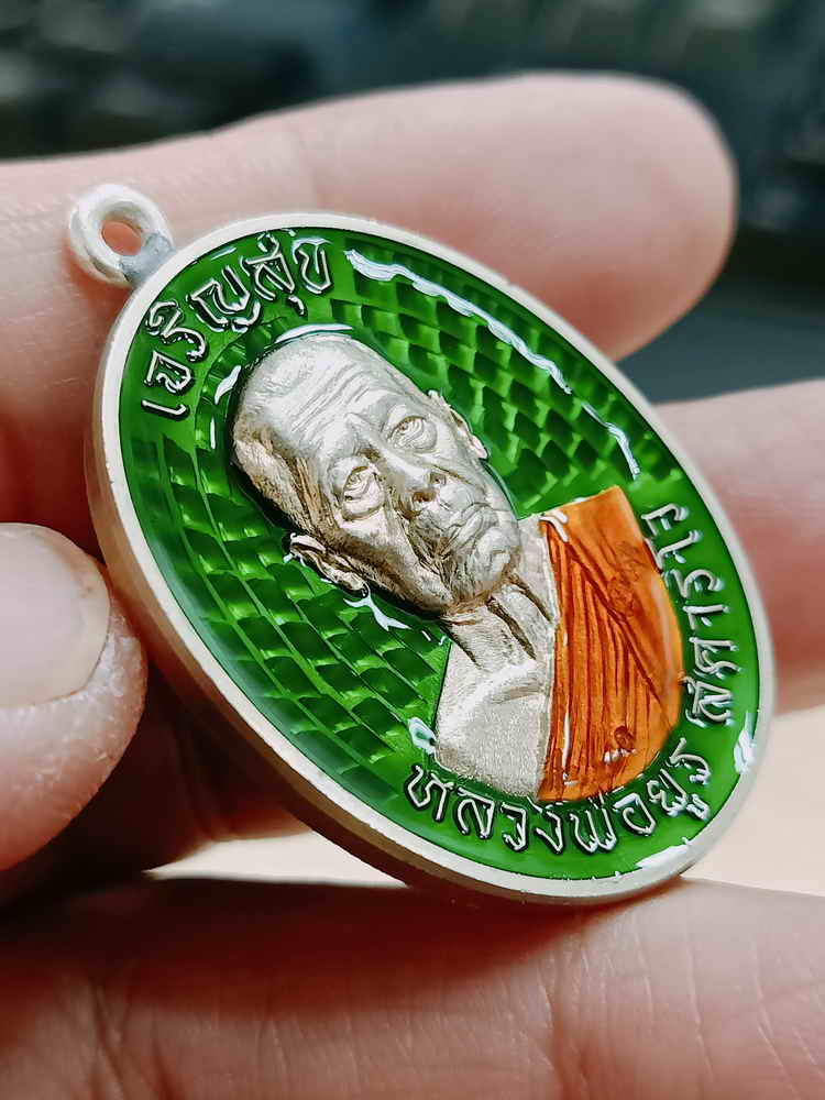 วัดใจ 100 PSGA เหรียญเจริญสุข งานบุญกฐิน หลวงพ่อยูร สคารโว วัดพนมเศษเหนือ จ.นครสวรรค์ ปี 2566 เนื้ออัลปาก้า ขอบเรียบ ห่วงเชื่อมเงิน ลงยาเขียว จีวร หมายเลข 81 กล่องเดิม ***ป๋องสุพรรณการันตี