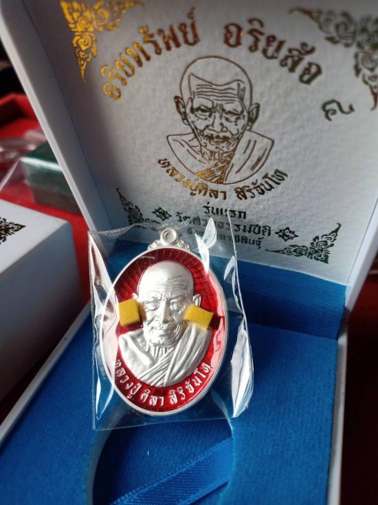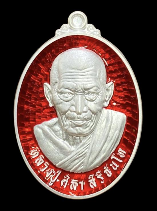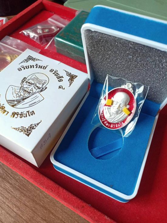วัดใจ สวยแชมป์หลวงปู่มหาศิลา สิริจันโท(หลวงปู่ศิลา) รุ่นแรก เหรียญอริยทรัพย์ อริยสัจ ๔ เหรียญเนื้อเงินลงยาแดง เลข ๘๔๔ กล่องครบครับ