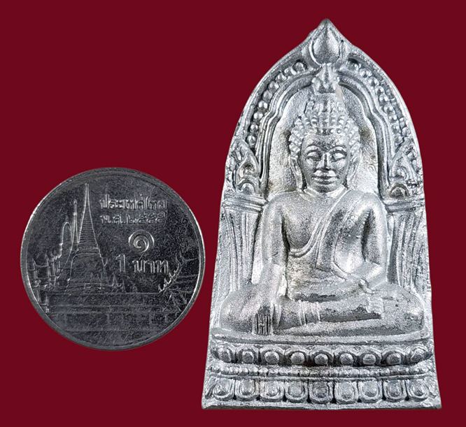 พระพุทธชินราชใบเสมา รุ่นประทานพร เนื้อชินเงิน หรือเนื้อปรอทขาว จัดสร้างขึ้นในปี 2547 มาพร้อมกล่องเดิมจากวัดครับ