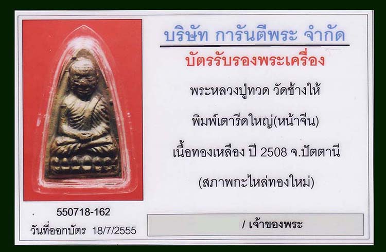 พระหลวงปู่ทวด วัดช้างให้ พิมพ์เตารีดใหญ่ (หน้าจีน) เนื้อทองเหลือง ปี 2508 จ.ปัตตานี (สภาพกะไหล่ทองใหม่)