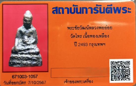 พระชัยวัฒน์ หลวงพ่ออ๋อย วัดไทร ปี 2493 พร้อมบัตรรับรอง