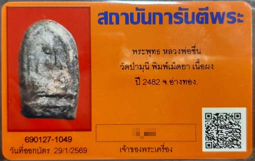 พระพุทธหลวงพ่อชื่น พิมพ์เม็ดยา(เม็ดบัว) เนื้อผง ปี2482 วัดป่ามุนี จ.อ่างทอง พร้อมบัตรรับรองครับ