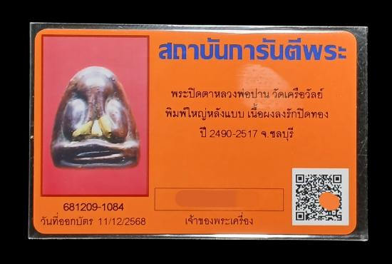เคาะเดียวต่ำกว่าทุน...ปิดตาหลวงพ่อปาน วัดเครือวัลย์ ชลบุรี พิมพ์ใหญ่หลังแบบ เนื้อผงลงรักปิดทองเดิม ยุคต้น ปี 2490-2517 พระสวยครับ พร้อมบัตรรับรองจากทางเว็บ