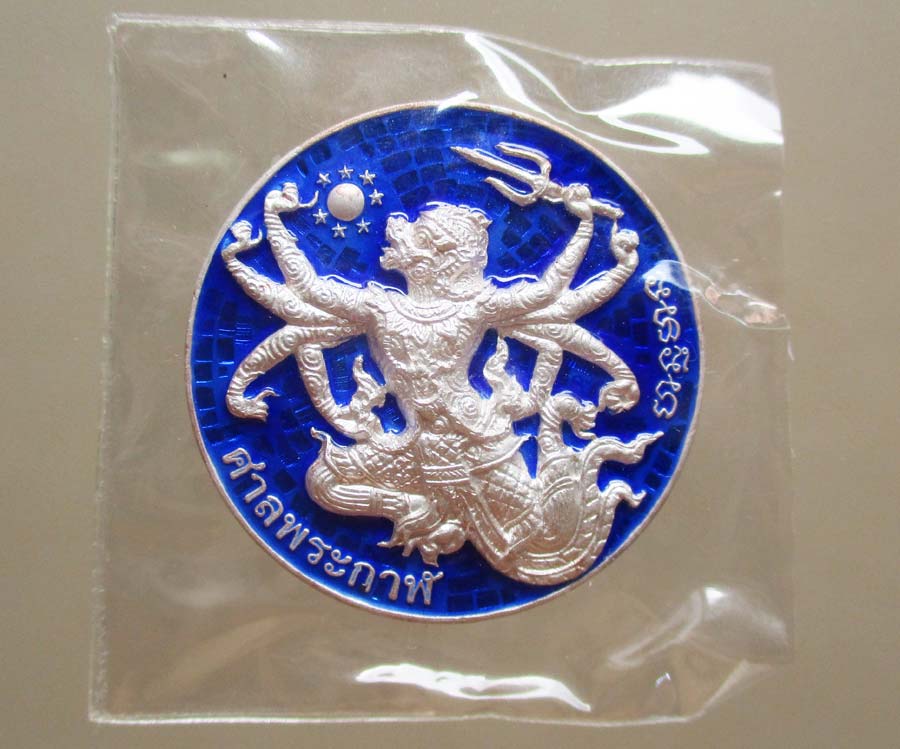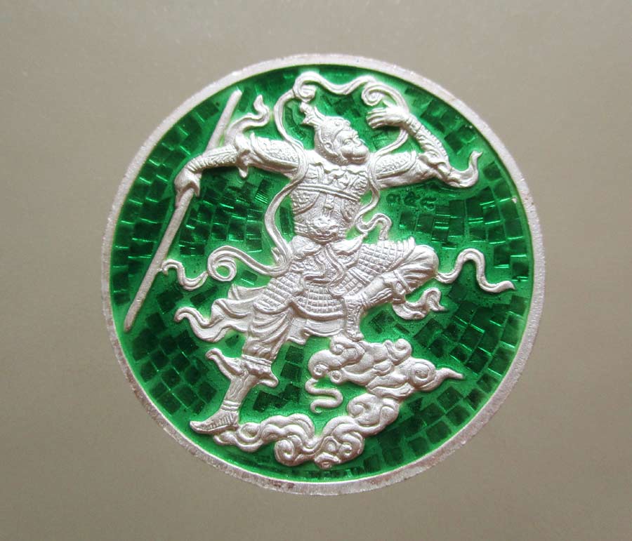 เหรียญเทพหนุมานหลังเจ้าพ่อเห้งเจีย ศาลพระกาฬ จ.ลพบุรี รุ่น ส ะท้านไตรภพ พิธีมหาพุทธาภิเษก พ.ศ.2547 เนื้อเงิน ลงยาสีน้ำเงิน - เขียว ต อกโค๊ต ตอกเลข สภาพสวยกริ๊บๆ !!